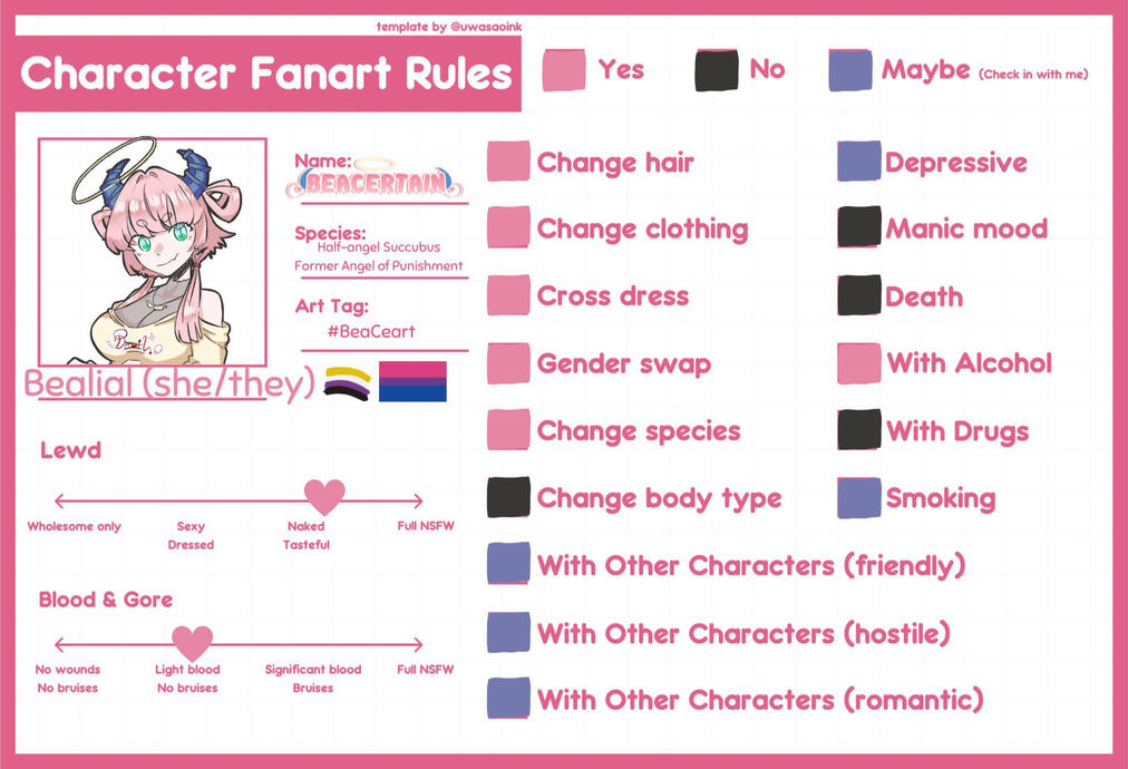 | Lots of cute and pink details | No bugs/insects in the drawing | Ask if it's NSFW/suggestive first - include reference images to show me what you're getting/drawing!! |