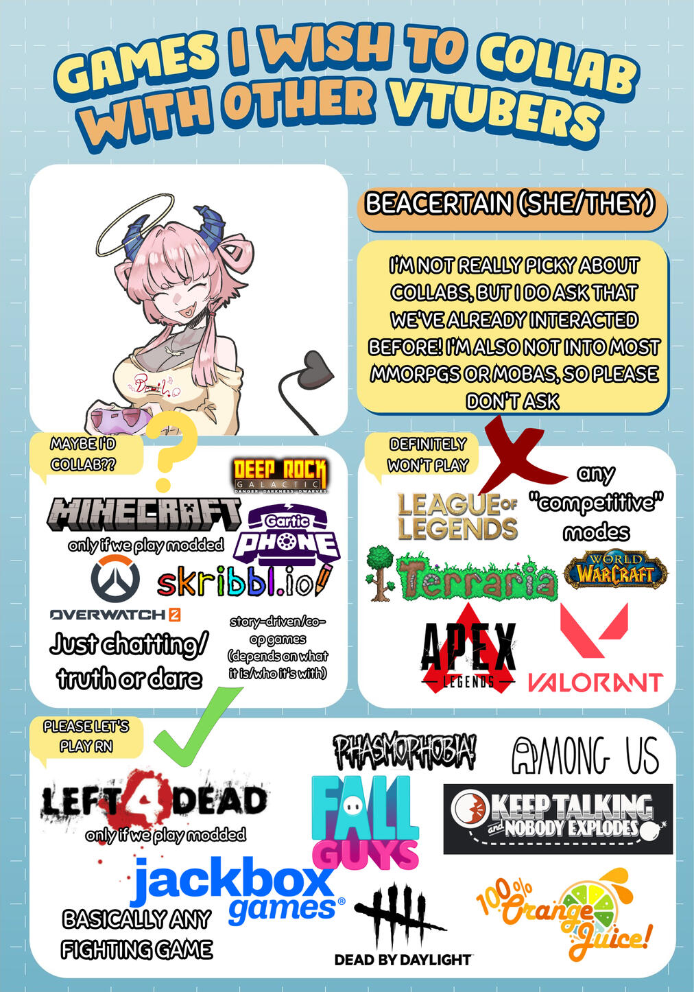 1. Creators in the collab must be 18+ if there is any violent, sexual, or otherwise graphic content involved. Please no collaborative partners under 17 years of age. Majority of collaboration partners should ideally be within the 18-30 age range as I am 27.2. Have an already established relationship with me (mutuals, following each other, friends)3. If this is our first time collaborating, please give me at least 2 weeks advanced notice with details of who, when, and what and any graphics for posts that I can do to announce the collab.4. Do not invite me to any collaborations involving or featuring people on my blacklist in any shape or form. This blacklist contains individuals that I am personally uncomfortable with and I am not willing to discuss more about why somebody is blacklisted with people who I am not already acquainted with. This is non-negotiable.5. Do not be overtly sexual or flirty with me in DMs or on stream without first discussing it with me. Harmless flirting is okay as long as I KNOW that's what it is.6. Understand that I prioritize my mental health and I may back out of collaborations last minute, if needed. I may also back out of a collaboration if it requires purchasing equipment or games that I do not have money for in my budget. My livelihood comes first.7. Give me time to prepare for the collaboration on the day of, preferably at least an hour before scheduled stream time so I can make sure my OBS is set up properly, games are working, I can meet people if I haven't already met them, etc.8. I will not do any collaborations that involve sharing personal details, such as my location, place of employment or education, or otherwise may endanger me or other streamers involved. This includes, but is not limited to: collabs that require meeting up in private settings, such as an office or home and collabs that may require people to meet in person.9. Share any boundaries or guidelines that you have about collaborations with me before the collaboration!※ Once you've read this and you're still interested in collaborating with me, contact me via DM on Twitter or Discord to set up for a collab! ※
